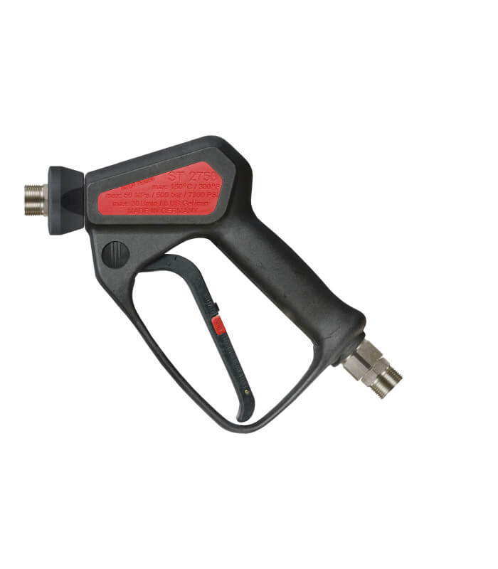 Pistolet avec raccord de sortie surmoulé adaptable sur lances rotatives.