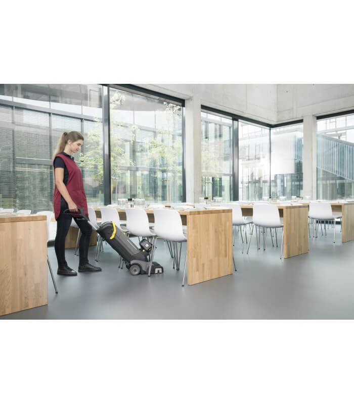 La variante BP Pack de l'autolaveuse BR 30/4 C ne pèse que 14 kg et bénéficie de dimensions relativement contenues, cette aspiro-laveuse fonctionne avec une batterie rechargeable, et garantit des surfaces rapidement sèches et non glissantes.