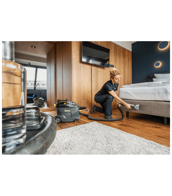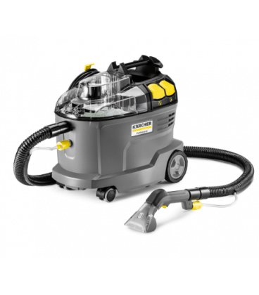 | Compact et pratique, l'aspirateur injecteur professionnel Puzzi 8/1 C est parfait pour nettoyer les textiles, les tapis, les sièges rembourrés et plus encore. Élimine efficacement la saleté et élimine les odeurs désagréables. Dans l'extraction par jet, l'eau et le détergent sont pulvérisés sur le tissu, puis immédiatement aspirés par la buse. Séchage rapide grâce à un puissant moteur d'aspiration. Vous n'avez donc pas besoin d'attendre de pouvoir à nouveau marcher sur une surface propre. Quatre roues et une poignée de transport intégrée offrent une excellente maniabilité. Buse à main avec pièce avant amovible, réservoir de collecte amovible pour une vidange facile, grandes commandes au pied et espace de rangement pour les accessoires. Caractéristiques et avantages