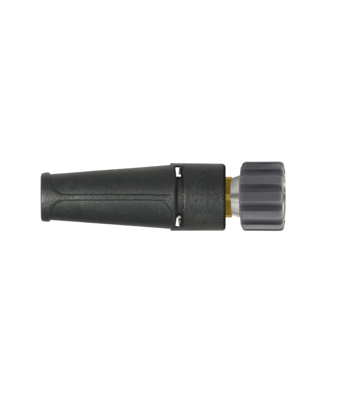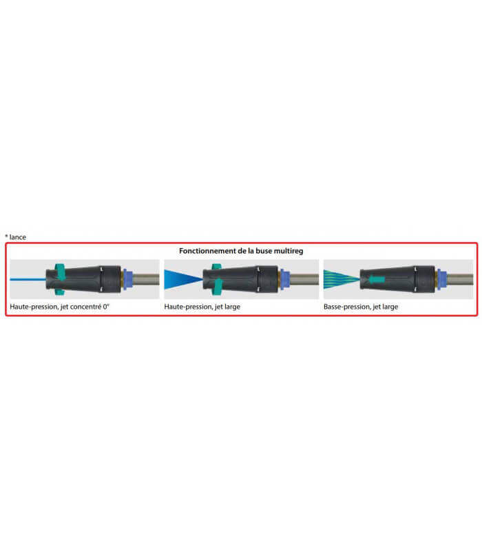 Cette buse permet de passer d'un jet large en basse pression à un jet très fin avec un fort impact.