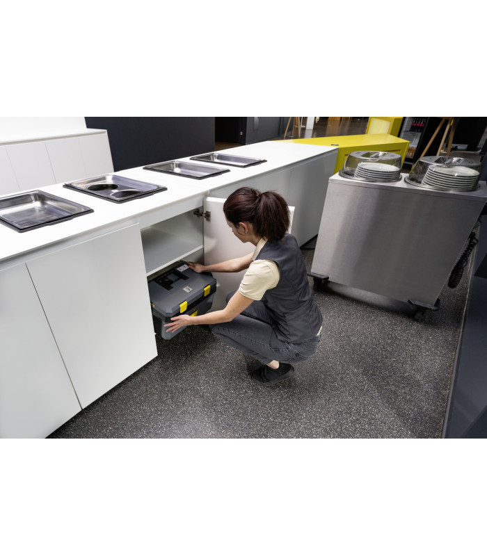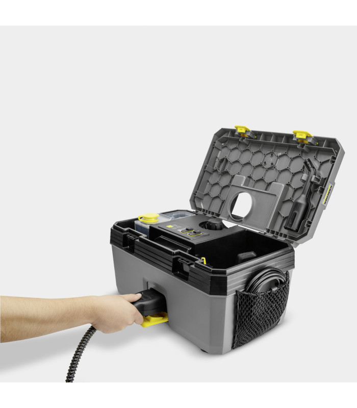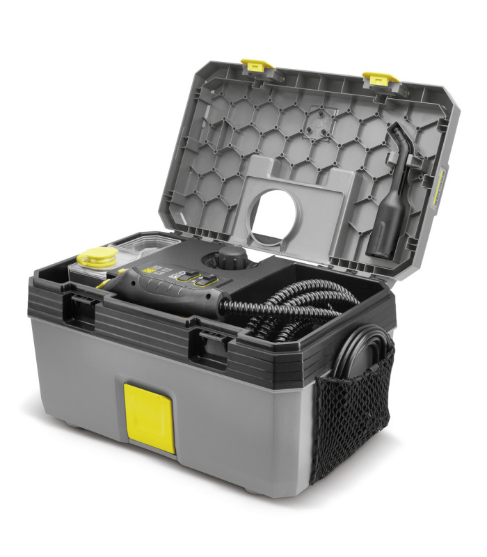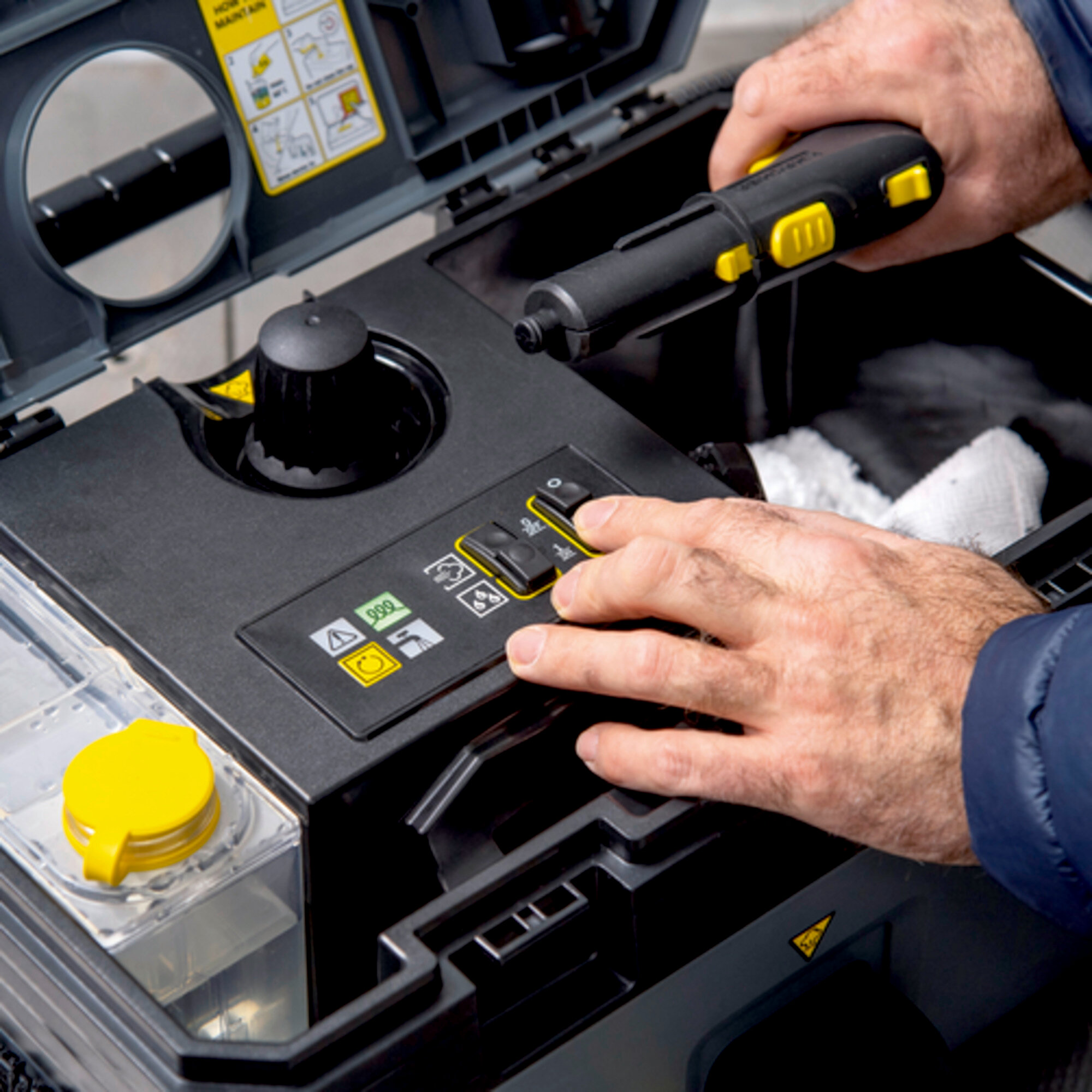 Design tout-en-un compact Appareil conçu pour une durabilité optimale, offrant robustesse et rentabilité. Rangement intégré des accessoires pour un encombrement minimal et une accessibilité optimale. Facile à transporter d’une seule main grâce à son poids réduit de seulement 7,5 kg. | Fonctionnement simple Boutons-poussoirs ergonomiques pour une mise en marche et un arrêt simplifiés. Voyants LED intégrés indiquant l’état de fonctionnement, le niveau d’eau et les besoins en maintenance. | Fonction VapoHydro Combinaison efficace de vapeur et d'eau chaude pour un nettoyage intensif. Rinçage aisé des résidus décollés. Optimise l’élimination des saletés les plus tenaces. |