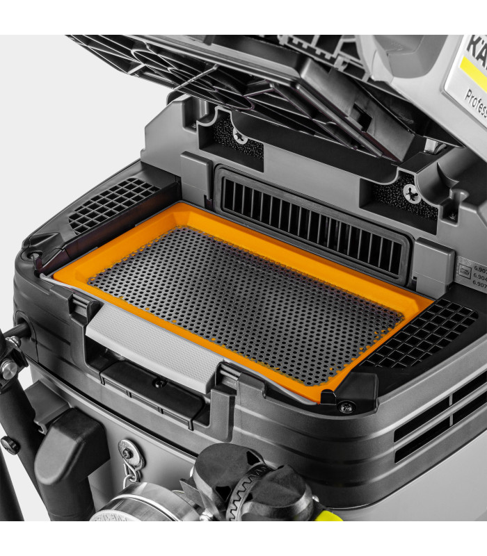 Pompe pour eau chargée intégrée Grâce à sa pompe intégrée, l’aspirateur permet d’aspirer et de refouler de grandes quantités d’eau en continu, sans interruption. | Interrupteur de protection des personnes PRCD-K avec connecteur IP68 Détection ultra-rapide des dysfonctionnements : l’appareil coupe l’alimentation en quelques fractions de seconde pour une protection efficace contre les chocs électriques. | Filtre panier intégré pour protéger la pompe des gros déchets Un système de filtration intégré protège la pompe d’évacuation contre les obstructions causées par les pierres, feuilles ou débris de bois. |