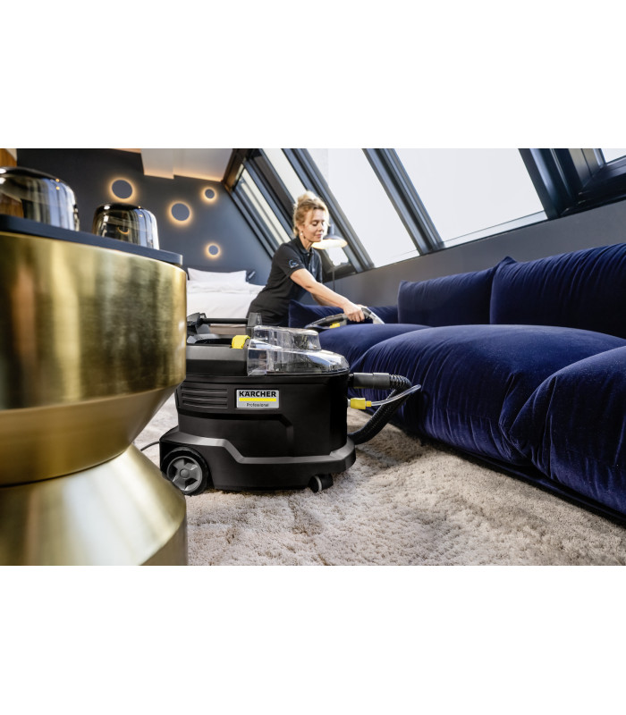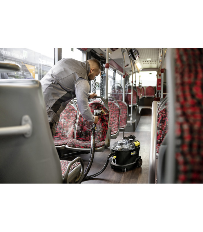 Performance de nettoyage exceptionnelle Nettoyage en profondeur parfait des surfaces textiles. Rapidité de séchage grâce une aspiration performante. Permet une exploitation plus rapide de la zone nettoyée. Excellent résultat de nettoyage avec effet avant/après visible. | Suceur fauteuil ergonomique et ultra court Boutons sur la poignée actionnables avec un seul doigt. La forme de la poignée permet différentes prises en main possibles. L'embout rouge de la buse optimise la consommation d'eau. | Léger, compact et robuste Transport sans effort, même d'une seule main, pour franchir les paliers et les marches d'escalier. Permet des intervalles de travail prolongés sans fatigue. Longue durée de vie garantissant une rentabilité élevée. |