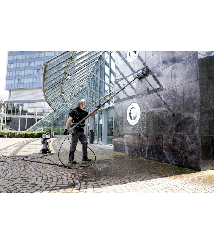 Utilisation polyvalente Pour le nettoyage des fenêtres, façades et panneaux solaires à l'eau osmosée. Pour le nettoyage à haute pression ou à basse pression à l'aide de brosses. | Ergonomie maximale Sécurité anti-rotation Anti Spin sur les lances pour un travail sûr et ergonomique. Attaches rapides avec un desserrage simple et rapide des tubes de la lance. Base rotative garantissant une utilisation facile et ergonomique. | Très pratique Réglage sans outils de l'effet de serrage au niveau des attaches rapides. Avec des crochets de serrage pour le guidage du flexible d'eau à l'extérieur de la lance. Pied avec crochet pour la fixation d'une sangle et du harnais |